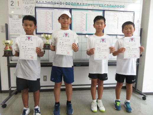 ![]() U11男子シングルス(左より) 優勝 武井 渉 選手 (HIDE TA) 準優勝 櫻井遥希 選手 (テニスラウンジ) |