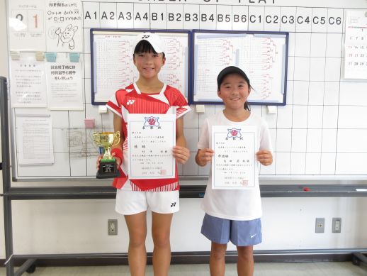 ![]() U9女子シングルス(左より) 優勝 三鴨まりな 選手 (HIDE TA) 準優勝 藤井葵唯 選手 (WiM 岐阜) |