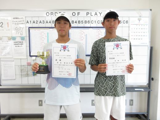 ![]() U15男子シングルス(左より) 優勝 阿部凜太朗 選手 (麗澤瑞浪高校) 準優勝 藤代健心 選手 (TEAM YONEZAWA 岐阜) |
