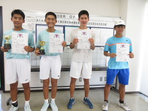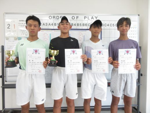 ![]() U17男子ダブルス(左より) 優勝 小西泰誠 選手・菅 優詩 選手 (麗澤瑞浪高校) 準優勝 山下悠大 選手・山下航大 選手 (岐阜高校) |