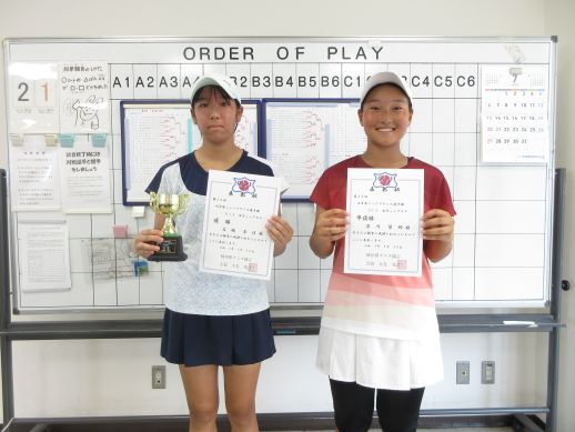 ![]() U15女子シングルス(左より) 優勝 高橋杏佳 選手 (聖マリア女学院高校) 準優勝 深川栞那 選手 (関スポーツ塾.T) |