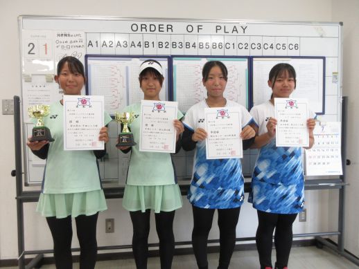 ![]() U17女子ダブルス(左より) 優勝 安江凛心 選手・千田こころ 選手 (県立岐阜商業高校) 準優勝 村上カンナ 選手・山口和奏 選手 (県立岐阜商業高校) |