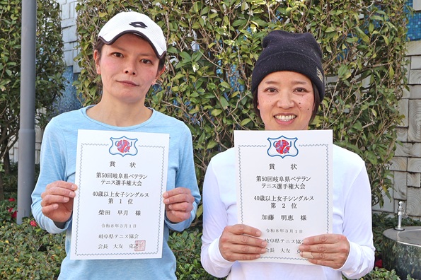 ![]() 40歳以上女子シングルス(左より) 優勝 柴田早月 選手(チームまごころ) 準優勝 加藤明恵 選手(PSPa) |