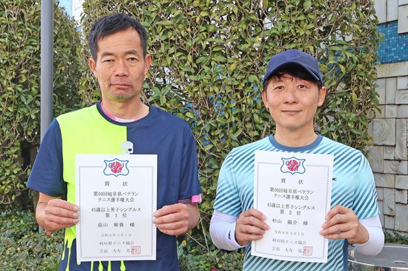 ![]() 45歳以上男子シングルス(左より) 優勝 畠山裕貴 選手(旭ヶ丘TC) 準優勝 杉山陽介 選手(BREAK BACK) |