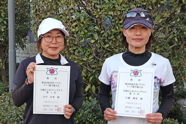 45歳以上女子シングルス(左より)優勝 田中由香 選手(旭ヶ丘TC) 準優勝 江藤晴美 選手(アドバンス) |