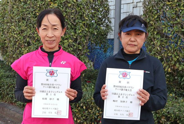 ![]() 55歳以上女子シングルス(左より) 優勝 松岡妙子 選手(岐阜西TC) 準優勝 梅村加津子 選手(TEAM KAZAMA) |