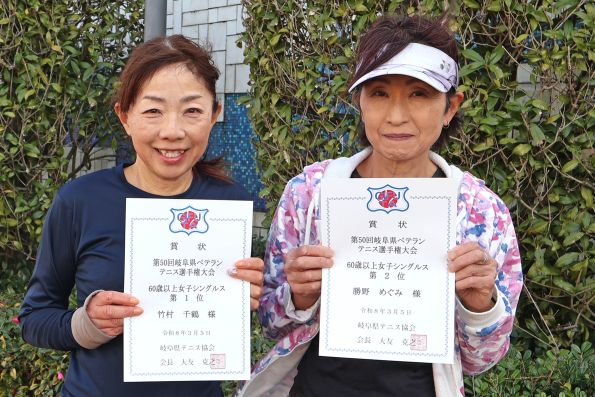 ![]() 60歳以上女子シングルス(左より) 優勝 竹村千鶴 選手(チームまごころ) 準優勝 勝野めぐみ 選手(恵那峡TC) |