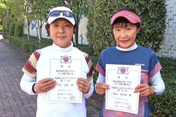![]() 65歳以上女子シングルス(左より) 優勝 竹内文恵 選手(大野TC) 準優勝 渡辺美由紀 選手(郡上市テニス協会) |