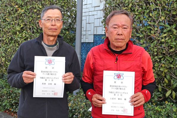 70歳以上男子シングルス(左より)優勝 荒巻宣昭 選手(美濃加茂LTC) 準優勝 上甫木敏弘 選手(西濃クラブ) |