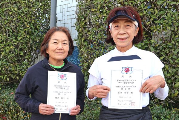 ![]() 70歳以上女子シングルス(左より) 優勝 櫻井裕子 選手(名古屋LTC岐阜) 準優勝 永田玲子 選手(アスクGTC) |