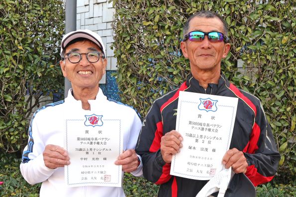 ![]() 75歳以上男子シングルス(左より) 優勝 中村光治 選手(名古屋LTC岐阜) 準優勝 塚本宗茂 選手(三和テニススクール) |