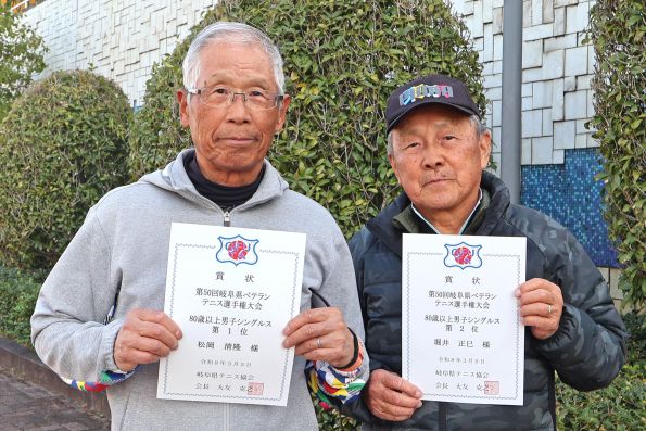 ![]() 80歳以上男子シングルス(左より) 優勝 松岡清隆 選手(SJC) 準優勝 堀井正巳 選手(西濃クラブ) |