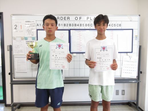 ![]() U15男子シングルス(左より) 優勝 阿部凜太朗 選手 (麗澤瑞浪高校) 準優勝 藤代健心 選手 (TEAM YONEZAWA 岐阜) |